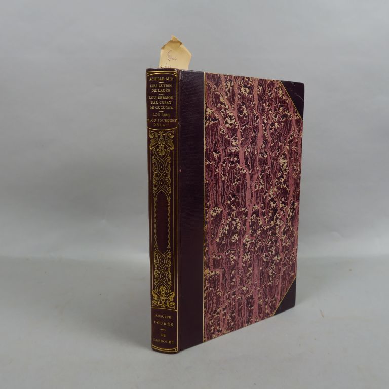 MIR (Achille). Lou lutrin de ladèr. Paris, Maisonneuve, Avignon, Roumanille (1883). – Lou rire seguit del pourquet de lait. 1ère édition. Carcassonne, Narbonne (1890). – Lou sermou del Curat de Cucugna. Carcassonne, s.d. – FOURÈS (Auguste). Le Midi gastronomique. Le cassolet. Monographie humoristique avec fac-similé d’un croquis à la plume de Falguière. Carcassonne, Lajoux 1889. 4 ouvrages en langue d’Oc, reliés en 1 vol. gd in-8. 1/2 maroquin aubergine à coins, dos lisse orné d’un décor doré en long, couv. cons. (Champs). Les 3 ouvrages d’Achille Mir sont illustrés de dessins par Narcisse Salières. Quelques rousseurs. Bel exemplaire.
