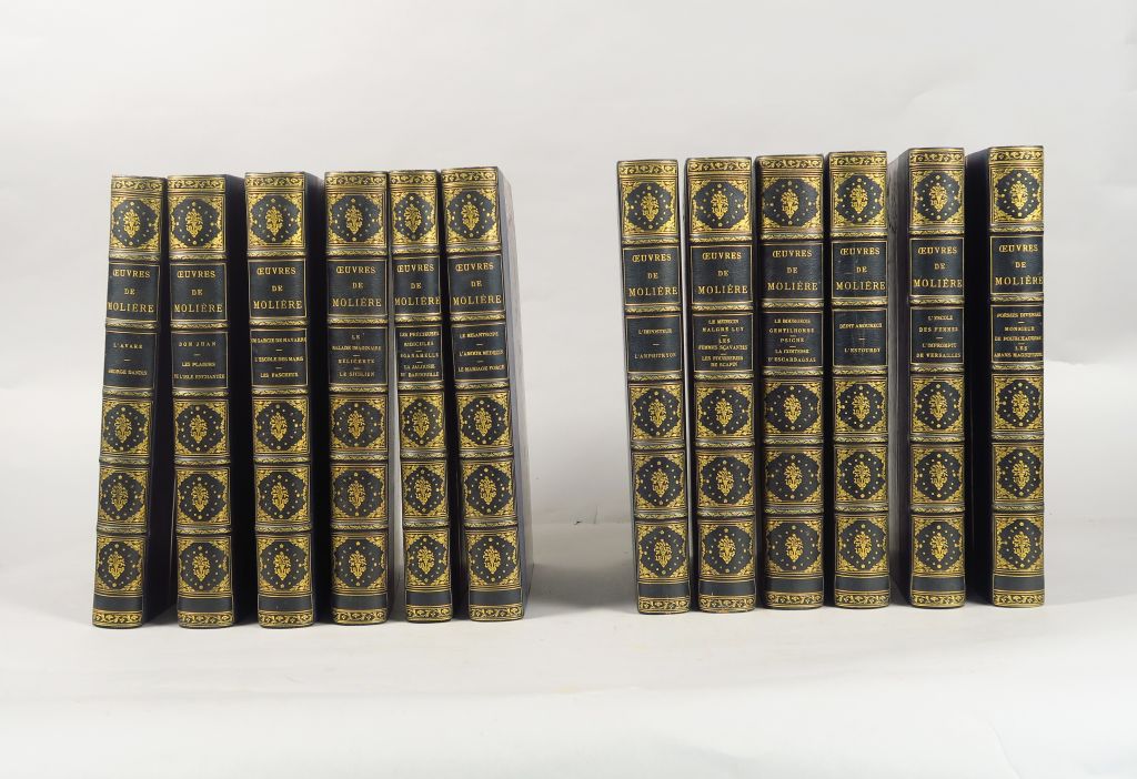 MOLIERE. Œuvres. Illustrations par Jacques Leman et Maurice Leloir. Notices par Anatole de Montaiglon et T. de Wyzema. Paris, Testard, Lemonnyer 1888-1892. 12 vol. in-4. maroquin ardoise, dos à 5 nerfs, caissons finement ornés, nerfs rehaussés de roulette dor. tête dor. Cette édition illustrée de Molière comprend 12 vol. mais se rencontre difficilement complète. Bel exemplaire
