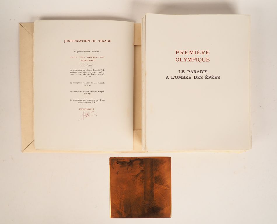 MONTHERLANT (Henry de). Les Olympiques. Burins de Eliane BEAUPUY. Paris, Sapienta 1947 in-folio en ff. Chemise et étui cartonné. Tirage : 270 ex. 1/22 vélin de rives contenant une suite des 22 burins et un cuivre encré et verni