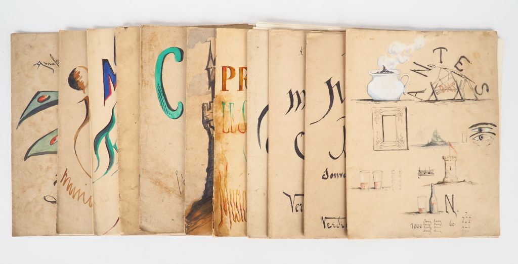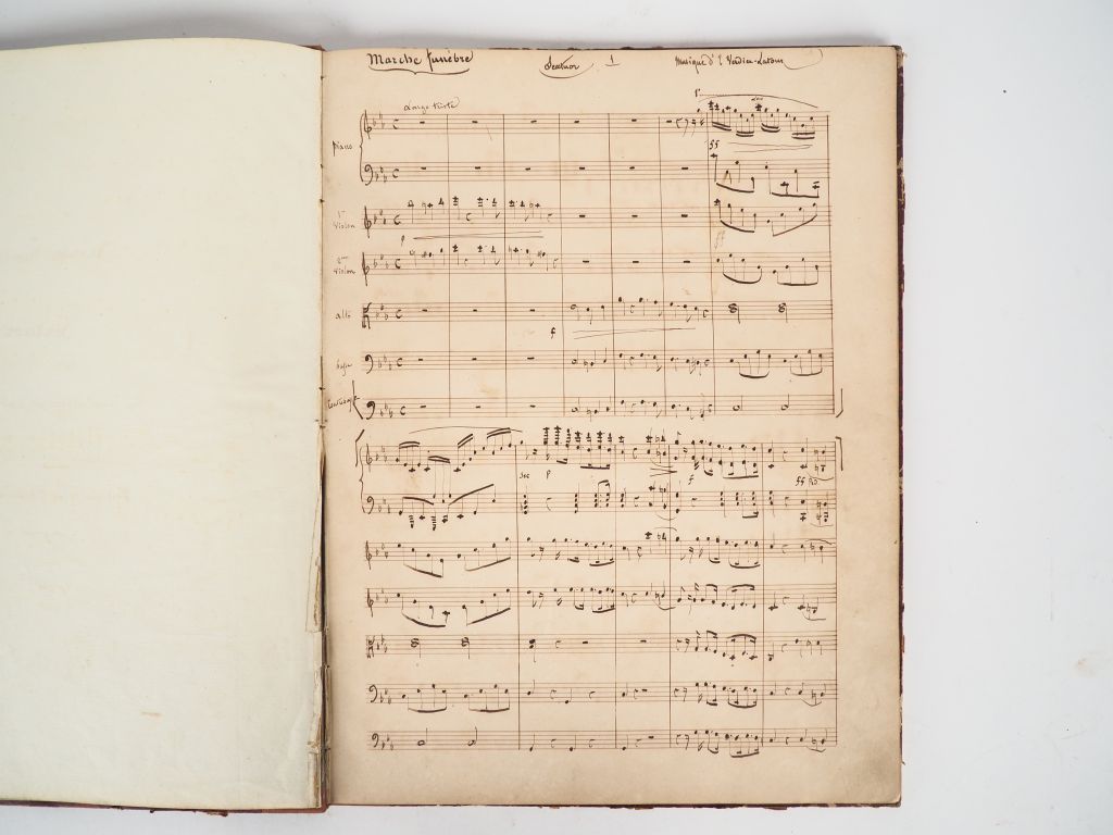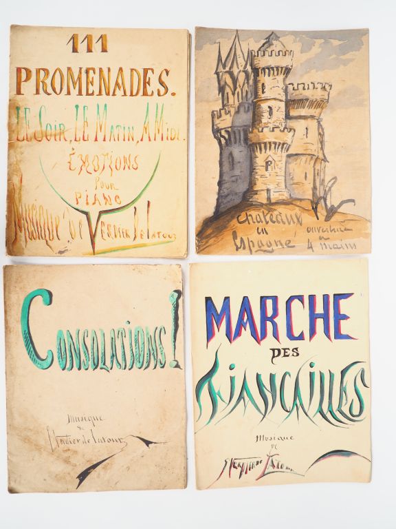 MUSIQUE VERDIER DE LA TOUR (E.) 12 partitions manuscrites originales. -Zibeline, Valse - Marche des Fiançailles - Inquiétude, valse pour piano. - Paysages asiatiques, Souvenirs de voyages, Musique pour piano. - Consolations ! Scènes pour piano. - 1er morceau de concert. - Chateaux en Espagne. Ouverture pour piano à quatre mains : 1874. - 111 promenades. Le soir, le matin, à midi. Emotions pour piano. - Scènes et paysages asiatiques. Souvenirs de voyage. Quadrille. 11 fascicules in folio en ff. Belles couvertures illustrées et calligraphiées. - Marche funèbre. Sextuor. Clermont-Ferrand 1848, in-folio cartonnage 1/2 toile.