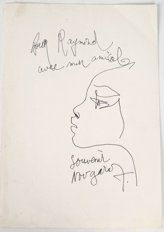 NOUGARO (Claude) (1929-2004). DESSIN ORIGINAL SIGNÉ (portrait de profil) avec ENVOI AUTOGRAPHE au peintre Raymond BARUQUE : « Pour Raymond / avec mon amical souvenir / Nougaro ». (Un feuillet vélin fort : 29 X 21 cm environ).