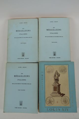 [Numismatique]. ARMAND (Alfred). Les Médailleurs italiens des quinzième et seixième siècles. Bologna, Forni editore 1966 (Réimpression anastatique). 3 vol. in-8, br. Joint : – La Médaille au temps de Louis XIV. Catalogue d'exposition de l'Hôtel de la Monnaie. Janvier-mars 1970. Fort vol. in-4, br. Nombr. pl. h.-t.