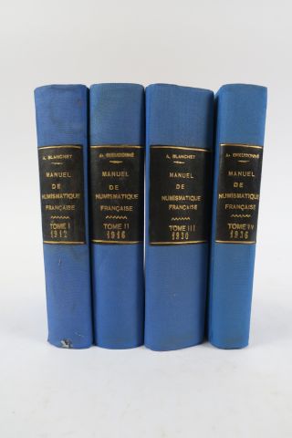 [Numismatique]. BLANCHET (A.) et DIEUDONNÉ (A.). Manuel de Numismatique française. Paris, Picard 1912, 1916, 1930 et 1936. 4 vol. in-8. Pleine toile bleue, large pce de titre havane noire (Reliure récente). Collection complète. Figures dans le texte et planches h.-t.
