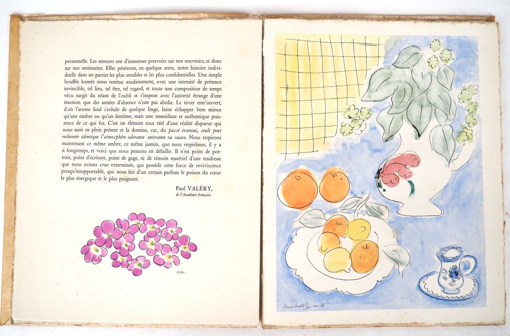 PARFUMS RAUCOUR. Imprimerie Kapp, 1945. Grand in-4 broché. Rousseurs plus marquées à la couverture et sur les premiers et derniers ff. ÉDITION ORIGINALE de cet ALBUM PUBLICITAIRE conçu et réalisé par Michel de Brunhoff pour les parfums RAUCOUR. Il contient 4 TEXTES de Paul Valéry Puissance des parfums, Jacques de Lacretelle Philosophie des parfums, Louise de Vilmorin Le choix d’un parfum et Colette Connaissance des parfums, respectivement illustrés en couleurs dans le texte et à pleine page par Henri MATISSE, André DERAIN, Christian BÉRARD et Kess VAN DONGEN. Tirage limité à 1000 exemplaires numérotés sur pur chiffon d’Auvergne.