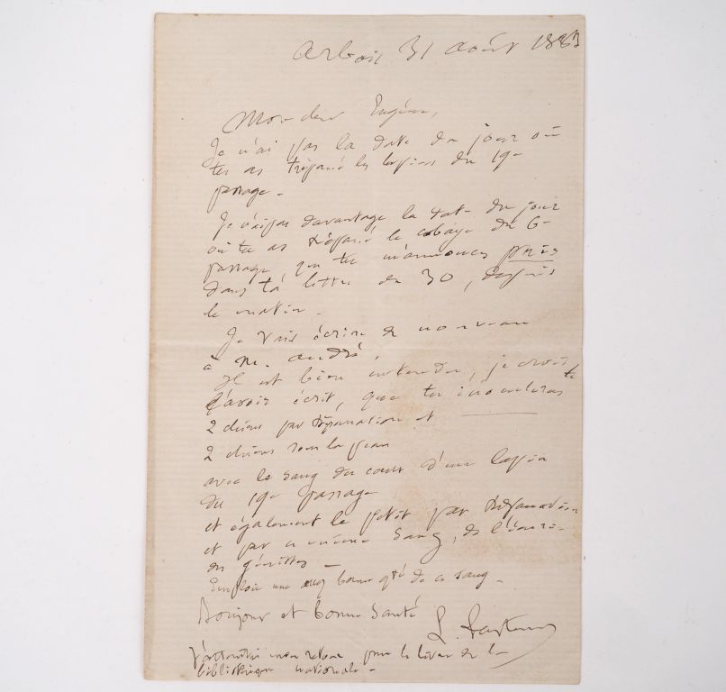 PASTEUR (Louis). LETTRE AUTOGRAPHE signée adressée à Eugène Viala. Arbois 31 août 1883. 1 page in-8. INTÉRESSANTE LETTRE À SON COLLABORATEUR ET PRÉPARATEUR Eugène VIALA (1858-1926) dans laquelle il évoque la trépanation de lapins et l’inoculation de « 2 chiens par trépanation et 2 chiens sous la peau avec le sang du cœur d’un lapin du 19e passage […] ». Ce sont ces expériences qui mèneront Pasteur à mettre au point le vaccin contre le virus de la rage en 1885.