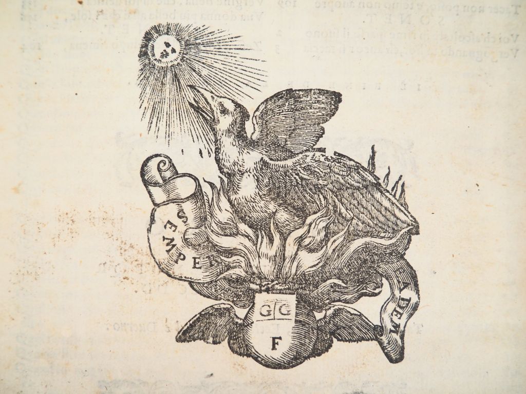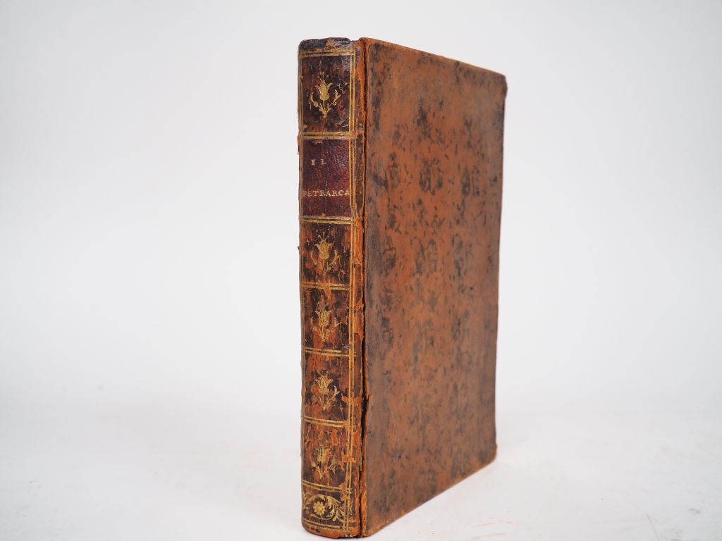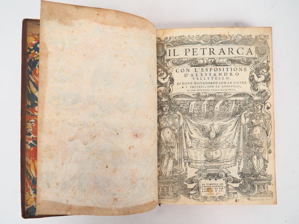 PÉTRARQUE. IL PETRARCA con l’espositione d’Allessandro Vellutello. Vinegia [Venise], Gabriel Giolito de Ferrari, 1560. Petit in-4 veau fauve marbré, dos lisse cloisonné et orné, pièce de titre maroquin rouge, tranches rouges (Reliure XVIIIe) , (12) ff., 216 ff. Manque de papier à l’angle inférieur droit du feuillet 95 avec manque de quelques lettres, mors supérieur entièrement fendu mais coutures solides. RARE ÉDITION XVIe imprimée à Venise. BEAU TITRE ILLUSTRÉ et gravé avec la devise « Semper eadem », une gravure à pleine page et nombreux bois gravés dans le texte, bandeaux et lettrines ainsi que la marque de l’imprimeur au verso du dernier feuillet.