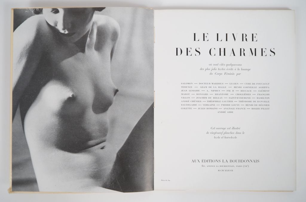 [PHOTOGRAPHIE]. LE LIVRE DES CHARMES. Paris, Éditions La Bourdonnais, 1937. In-4 broché, couverture rempliée. ÉDITION ILLUSTRÉE de cet ouvrage de « textes écrits à la louange du Corps Féminin » illustré de 29 reproductions photographiques en noir et blanc de nus féminins par André Steiner, Brassaï, Ergé, Reiss, Nérée, Luci Laub, Louis Caillaud, etc.