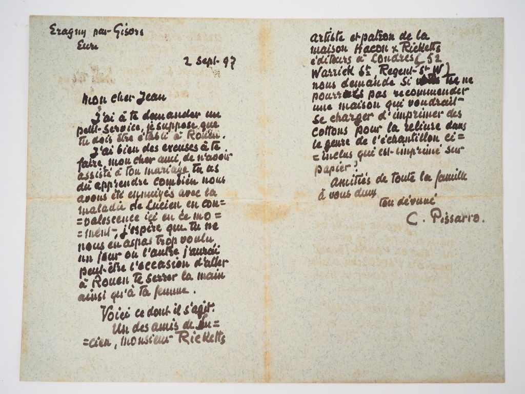 PISSARRO (Camille). LETTRE AUTOGRAPHE SIGNÉE à « Mon cher Jean ». Eragny par Gisors, 2 sept. [18]97. Une page ½ in-12. LETTRE dans laquelle le peintre s’excuse tout d’abord de n’avoir pu assister au mariage de son ami Jean puis évoque son propre fils, Lucien (1863-1944), convalescent après des ennuis de santé. Il demande ensuite à son correspondant s’il pourrait lui « recommander une maison qui voudrait se charger d’imprimer des cottons [sic] pour la reliure dans le genre de l’échantillon ci-inclus qui est imprimé sur papier ? [échantillon manquant] ». C’est un service qu’il sollicite pour un ami de son fils, l’artiste, éditeur et collectionneur d’art britannique Charles RICKETTS (1866-1931).