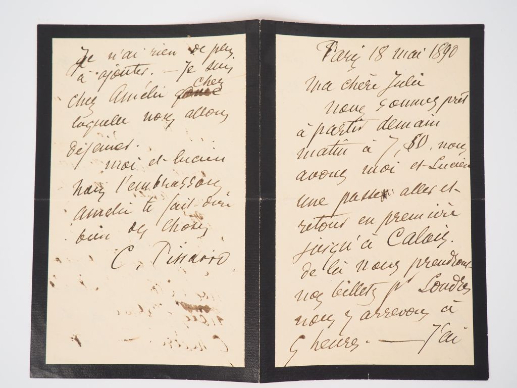PISSARRO (Camille). LETTRE AUTOGRAPHE SIGNÉE adressée à sa femme Julie. Paris, 18 mai 1890. 4 pages in-12 sur un feuillet double de papier de deuil. BELLE LETTRE qui laisse entrevoir l’intimité de la famille Pissaro et permet de se rendre compte à quel point le peintre prenait son rôle de père au sérieux. Camille PISSARO s’apprête à partir pour Londres avec son fils Lucien. Il évoque ensuite un autre de ses fils, Félix, surnommé « Titi » : « Ce que tu me dis de Titi est fort ennuyeux, mais je crois qu’il est encore bien enfant pour penser sérieusement, il aime à jouer, il faut être un peu patient pour ne pas gâter l’avenir. N’avons-nous pas tous été la même chose. Si il ne fait pas plus de mal que de jouer, il faut patienter. - Cependant il faut le gronder un peu et tâcher qu’il fasse la tâche qu’il m’a promis de faire. Dis-leur qu’ils seront récompensés s’ils se conduisent bien. Je n’ai rien de plus à ajouter. »