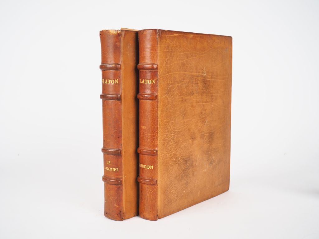 PLATON. Le Banquet suivi de Phédon. Traduction de Léon Morin, avec une préface de Charles Maurras. Paris, Typographie Léon Pichon 1933. 2 vol. in-4. Reliures jansénistes, veau blond, couv. et dos, dos à 4 nerfs (H.P. Labussière)