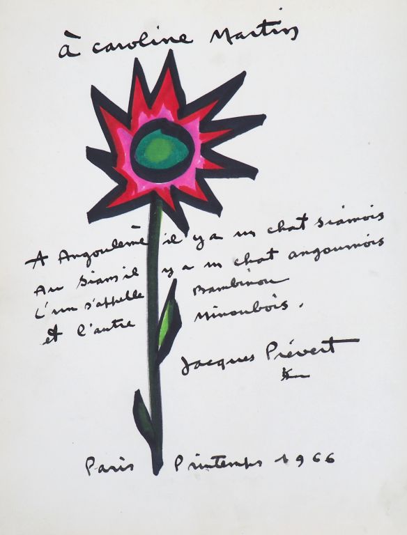 PRÉVERT (Jacques). LE PETIT LION. Photographies par Ylla. P., Arts et Métiers Graphiques, 1958. In-4 cartonné, jaquette papier à rabats illustrée. ÉDITION ORIGINALE ILLUSTRÉE de photographies en noir et blanc d’YLLA. MAGNIFIQUE E.A.S. de l’auteur à pleine page en regard de la page de titre, agrémenté d’un DESSIN COULEURS (fleur) : « à Caroline Martin / A Angoulème il y a un chat siamois / Au Siam il y a un chat angoumois / L’un s’appelle Bambinou / et l’autre Minoubois, Jacques Prévert / Paris Printemps 1966 ». L’ouvrage a été envoyé par la poste sous enveloppe kraft (cachet de la poste et timbre) qui a été conservée en parfait état : au verso Prévert a cachetée l’enveloppe avec 3 chromos de fleurs et oiseau.
