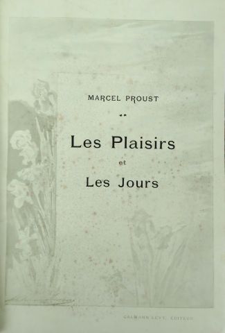 PROUST (Marcel). Les Plaisirs et les Jours. Illustrations de Madeleine LEMAIRE. Préface d'Anatole France et quatre pièces pour piano de Reynaldo Hahn. Paris, Calmann Levy 1896. in-4, X-273 pp. Bradel 1/2 basane aubergine, tête dor., couv. cons. (Rel. d'époque). Edition originale du premier livre de Proust enrichi d'un envoi a.s. au Dr François Boissier : « comme un hommage de très profonde et très reconnaissante sympathie ». Petites piqûres au plat sup. de la couverture.