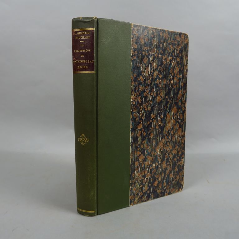 QUENTIN-BEAUCHART Ernest). La bibliothèque de Fontainebleau et les livres des derniers Valois à la Bibliothèque Nationale (1515-1589). Paris, Paul, Huard et Gullemin 1891. in-8. 234 pp. Bradel 1/2 percaline verte, pce de titre (Rel. de l’époque). Frontispice en chromolithographie et 4 planches. Tirage limité à 300 exemplaires. 1/250 vélin.