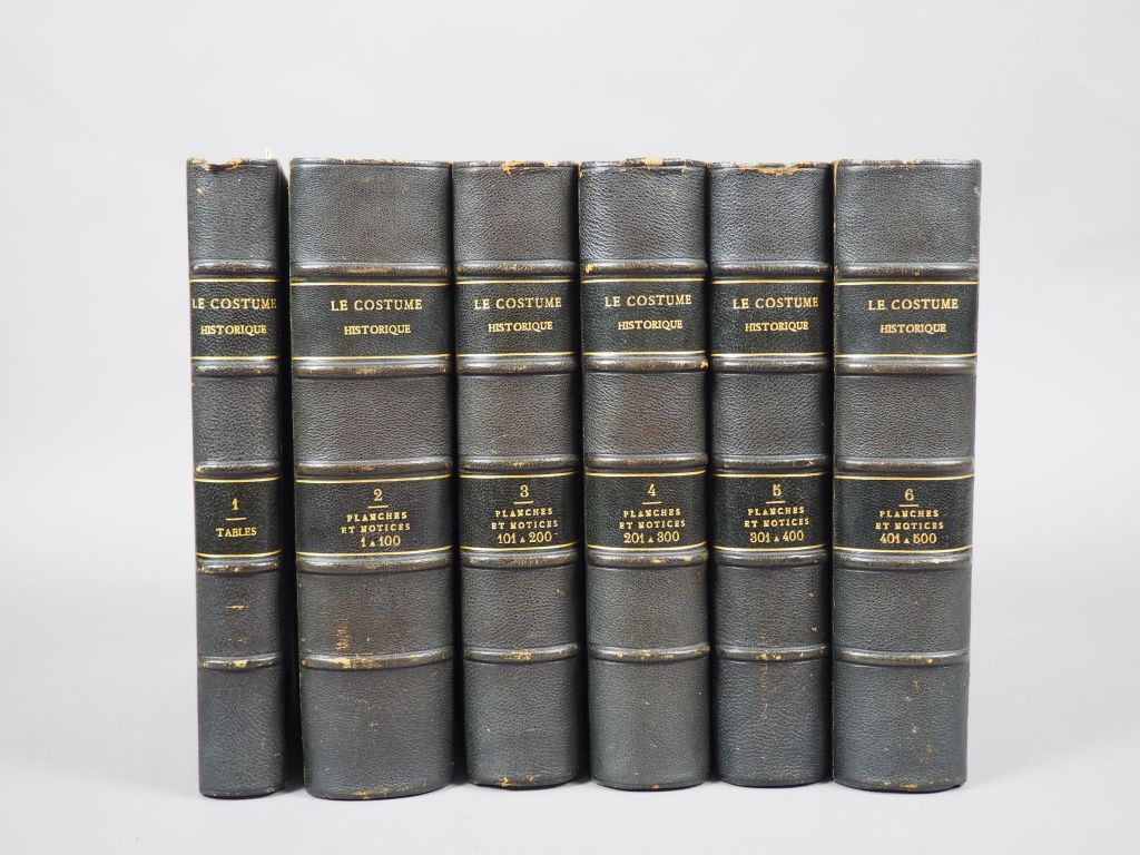 RACINET (A.). Le Costume historique. Types principaux du vêtement et de la parure. Cinq cent planches, trois cents en couleurs, or et argent, deux cent en camaïeu. Avec des notices explicatives, une introduction générale des tables et un glossaire. Paris, Firmin-Didot 1888. 5 vol. in-4. Reliure 1/2 chagrin vert foncé.