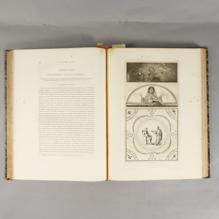 ROLLER (Théophile). Les Catacombes de Rome. Histoire de l'Art et des croyances religieuses pendant les premiers siècles du christianisme. Paris, Vve Morel s.d. (1881). 2 vol. gd in-4. 1/2 chagrin tête de nègre (Rel. d'époque). Description très complète illustrée de 101 planches en héliogravure. Qqs rousseurs. Mors frotté et accrocs à 2 coiffes de la reliure