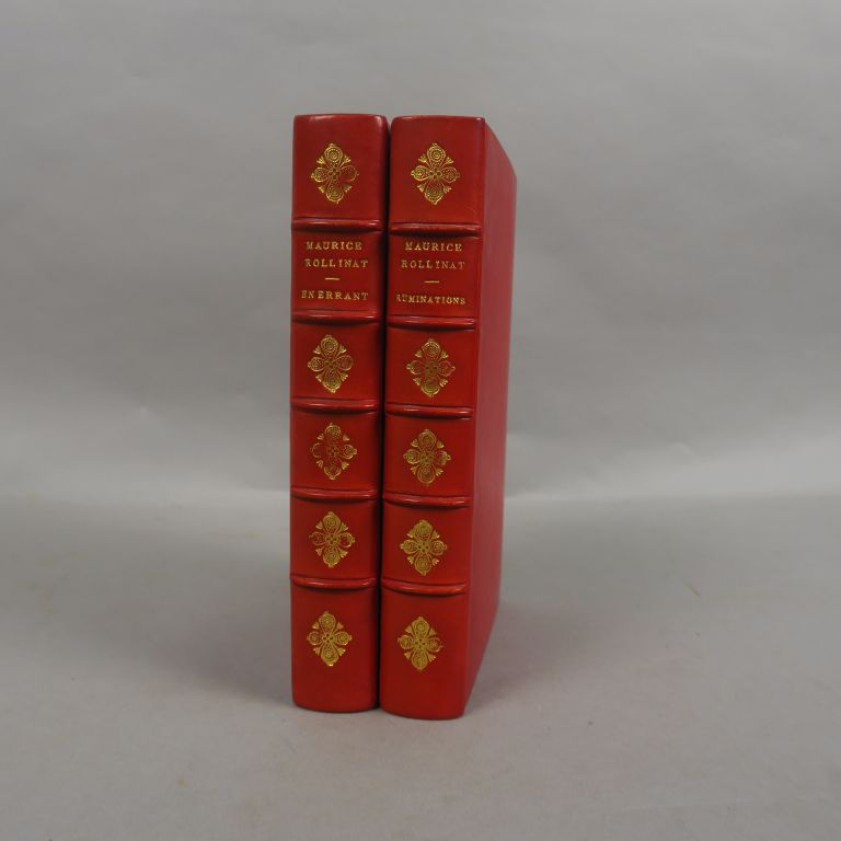 ROLLINAT (Maurice). En errant. Proses d’un solitaire. Paris, Charpentier 1903. – Ruminations. Proses d’un solitaire. Paris, Charpentier 1904. 2 vol. in-12 plein veau cerise, dos à 5 nerfs, fleur. dor., dent. int., têtes dorées, couv. et dos cons. (Rel. de l’époque). Éditions originales sur papier d’édition très joliment reliées.