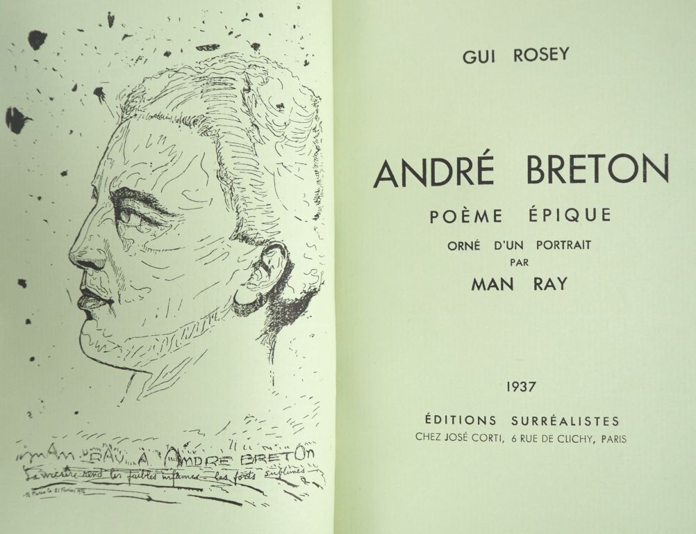 ROSEY (Gui). ANDRÉ BRETON. Poème épique. P., Éditions Surréalistes, 1937. Plaquette in-8 carré brochée, couverture rempliée. ÉDITION ORIGINALE. Portrait d’André Breton par MAN RAY reproduit en frontispice. Tirage limité à 150 exemplaires. UN des 15 numérotés sur papier vert Roy Louis (n°IV), tirage de tête. ENVOI AUTOGRAPHE signé sur le faux-titre : « à Monsieur James Ducellier / en souvenir de notre ami Yves Tanguy / avec la vive sympathie de Gui Rosey ».