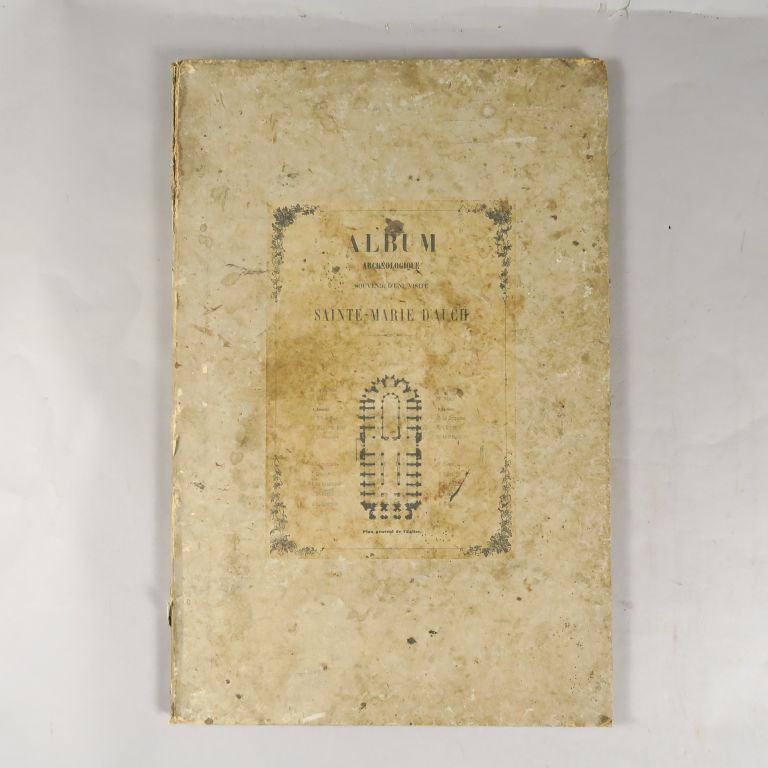 SAINTE-MARIE D'AUCH. Album archéologique. Souvenir d'une visite à Sainte-Marie d'Auch. gd in-folio. Cartonnage papier. Album composite vendu au bénéfice de la Chapelle du Petit Séminaire d'Auch (ca 1860), comprenant 23 planches dont 7 planches de la "Collection complète des brillants vitraux de l'église Cathédrale d'Auch". Dessinés par G.G. Lettu (1835). Fortes salissures au cartonnage, quelques rousseurs aux planches