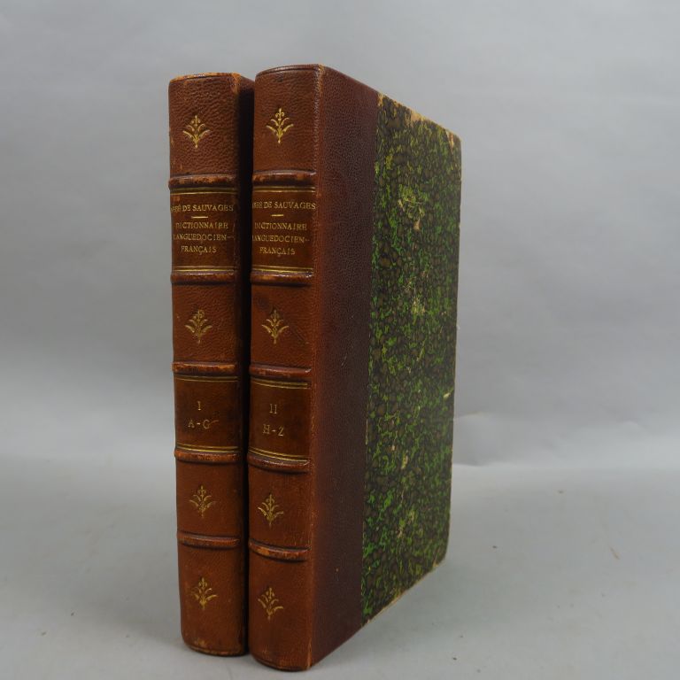 SAUVAGES (Abbé Boissier, de). Dictionnaire Languedocien-Français, contenant un recueil des principales fautes que commettent, dans la diction et dans la prononciation françaises, les habitants des provinces méridionales, connues autrefois sous la dénomination générale de la langue-d’oc. Suivi d’une collection de proverbes languedociens et provençaux. Alais, Martin 1820-1821. 2 vol. in-8. 1/2 chagr. havane, fleur. dor. (Rel. postérieure). 4ème édition, la plus complète.
