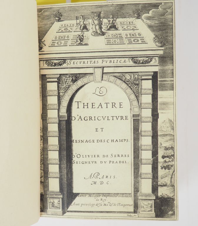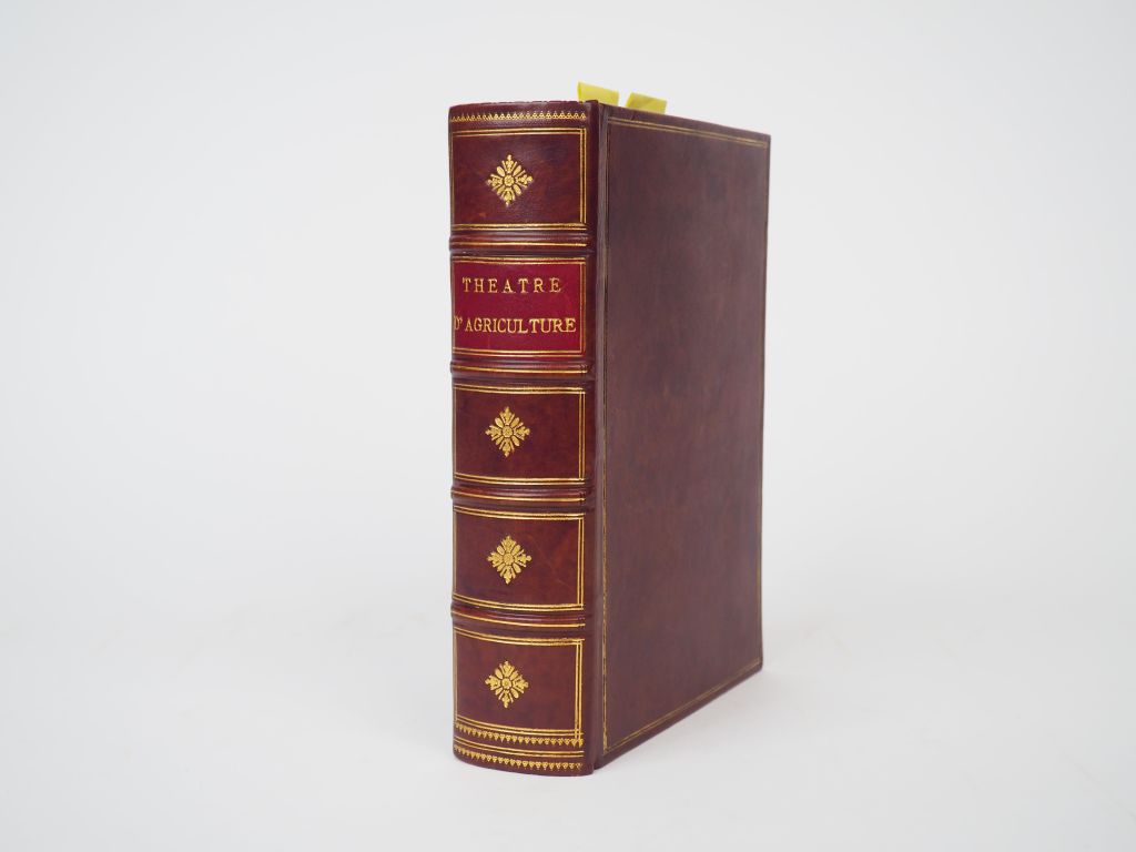 SERRES (Olivier de). Théâtre d'Agriculture et mesnage des champs. Paris, Jamet Mettayer 1600. in-4, 17 ff. n.ch. - 968 pp + table. Veau brun, caissons et fleur. dor., double fil. d'encadr. des plats (Rel. moderne à l'imitation) Edition originale du premier grand traité d'agronomie français. La page de titre manque, le titre-frontispice et la planche dépliante ont été remplacé par des copies. Les derniers ff. de table manquent. Trace de mouillure.