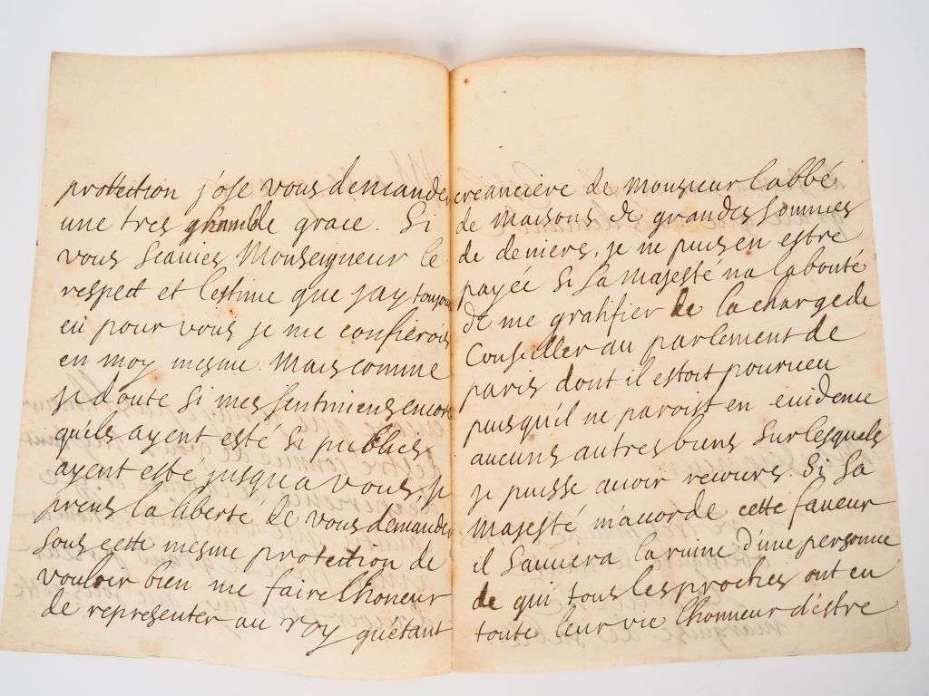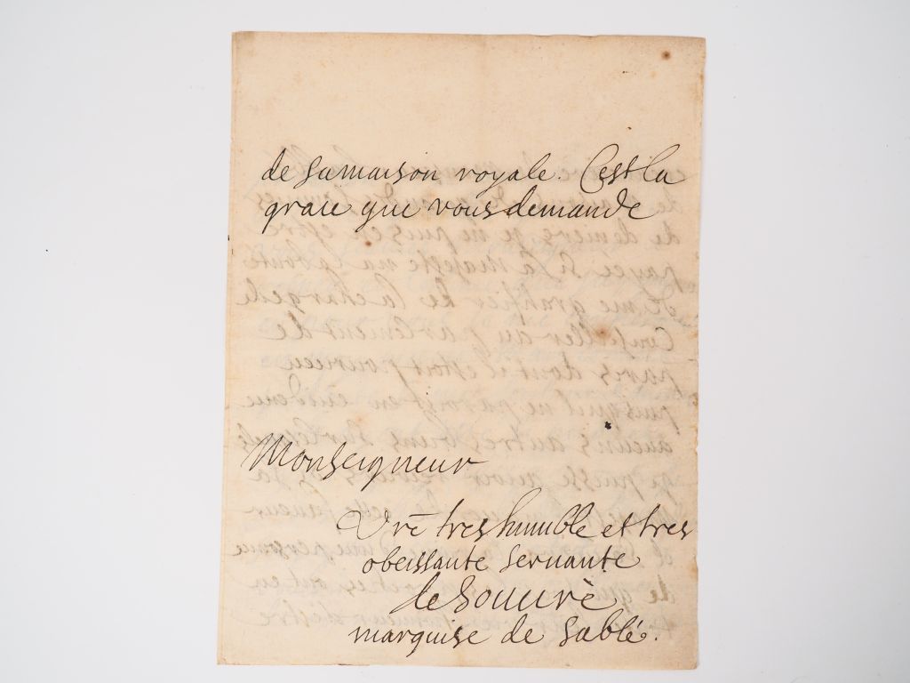 SOUVRÉ (Marquise de Sablé, Madeleine de). LETTRE AUTOGRAPHE signée. [Février 1669]. 4 pp. in-4. TRÈS RARE SUPPLIQUE de la femme de lettres, qui tînt salon et recevait chez elle le tout-Paris intellectuel et mondain, auprès du roi Louis XIV. Se trouvant dans une situation financière difficile, elle demande à « Sa majesté » de la « gratifier de la charge de Conseiller au Parlement de Paris » dont était pourvu « Monsieur labbé de Maisons » [Guillaume de Longueil, abbé de Conches, mort en janvier 1669], ceci afin de la sauver de « la ruine ».