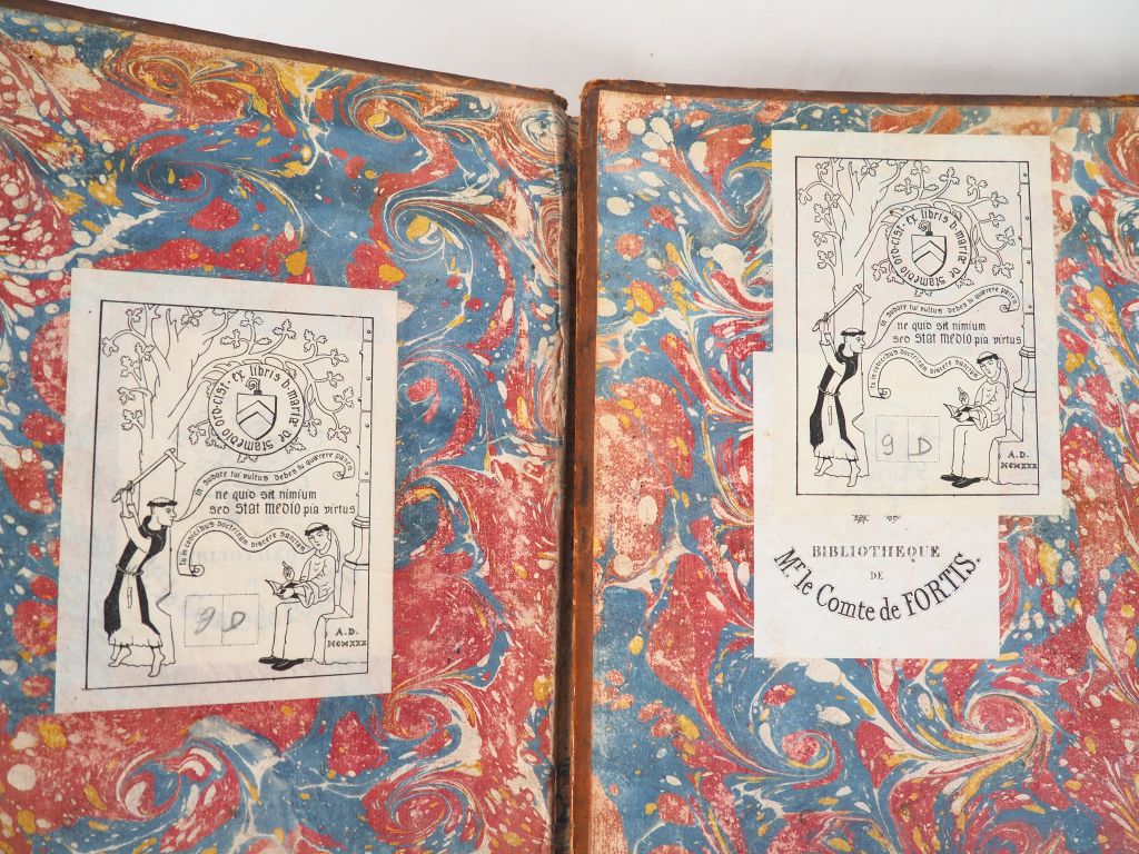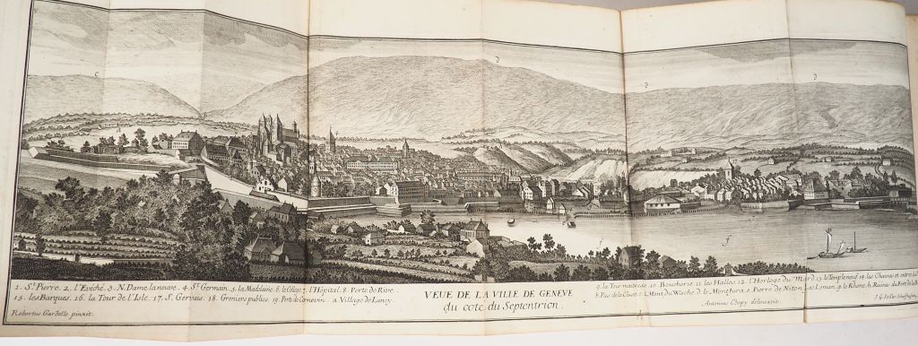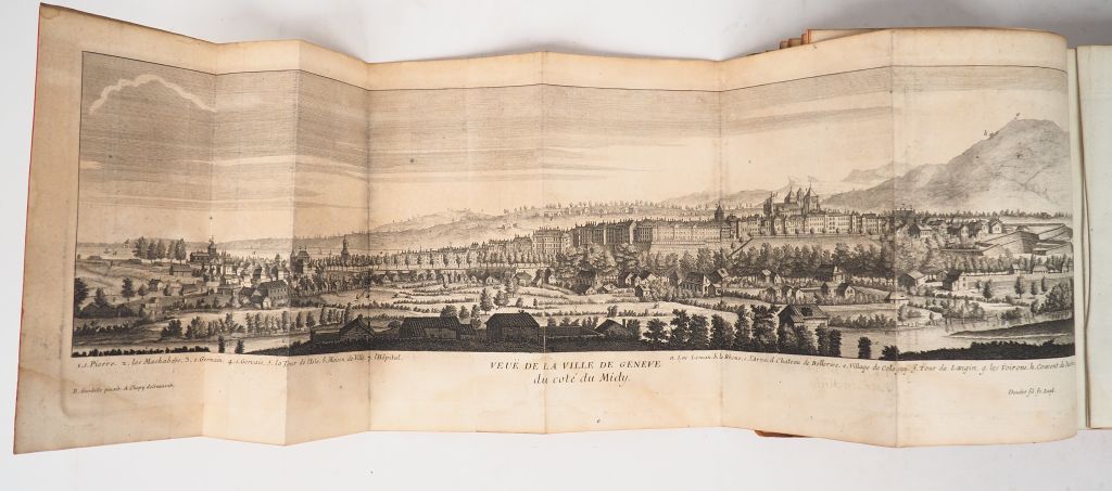 SPON (Jacob). HISTOIRE DE GENÈVE. Genève, Fabri Barrillot, 1730. Deux vol. in-4 veau blond glacé, dos à nerfs orné, pièces de titre et de tomaison, tranches rouges (Reliure de l’époque). Coiffes supérieures arasées, manque à une coupe, épidermures et frottements aux plats, coins ouverts avec manques, quelques mouillures marginales sans gravité. Deux ex-libris : « Bibliothèque de Mr le Comte de Fortis » et congrégation religieuse. NOUVELLE ÉDITION, revue et considérablement augmentée. Vignettes de titre gravées, 16 PLANCHES h.-t. gravées dont 2 grandes VUES dépliantes de Genève, une grande CARTE dépliante du lac de Genève, 11 planches de reproductions de sceaux et monnaies, une carte dépliante de Partie du Païs des Sequanois et une vue de Genève ancienne.