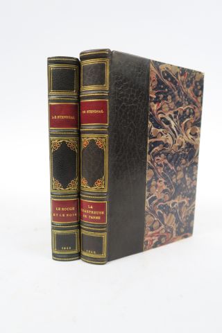 STENDHAL (HENRI BEYLE). Le Rouge et le Noir. Chronique du XIXe s. Paris, J. Hetzel 1846. – La Chartreuse de Parme, préc. d'une notice sur la vie et les ouvrages de Beyle par M. Colomb. Paris, J. Hetzel 1846. 2 vol. in-12. 1/2 maroquin olive, caissons dor. et fleur. mosaïqués, tête dor., couv. cons. (Rel. postérieure).