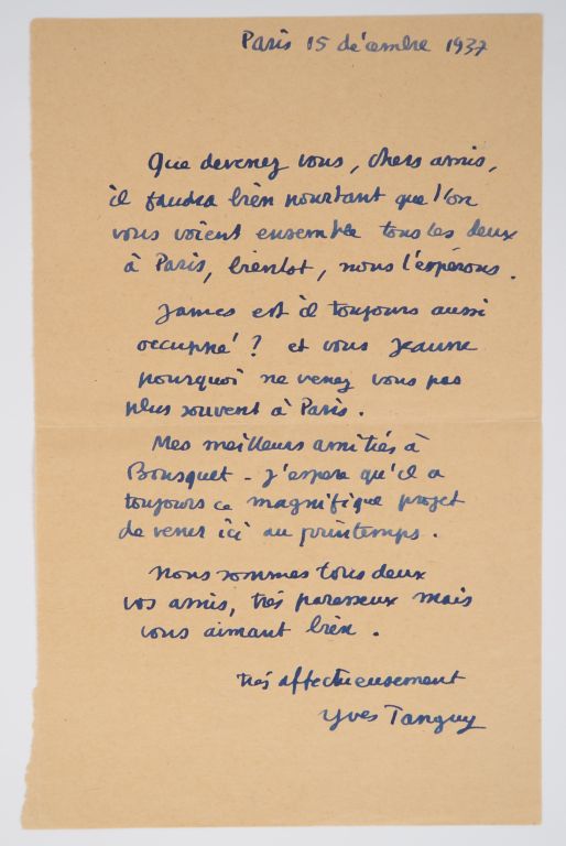 TANGUY (Yves). LETTRE AUTOGRAPHE signée adressée au couple Ducellier. « Paris 15 décembre 1937 ». Une page sur un feuillet (213 X 133 mm). Pliure centrale. LETTRE AU COUPLE DUCELLIER DE LEURS « AMIS TRÈS PARESSEUX ». « Que devenez vous, chers amis, il faudra bien pourtant que l’on vous voient [sic] ensemble tous les deux à Paris, bientôt, nous l’espérons. / James est-il toujours aussi occupé ? Et vous Jeanne pourquoi ne venez-vous pas plus souvent à Paris. / Mes meilleures amitiés à [Joë] Bousquet – J’espère qu’il a toujours ce magnifique projet de venir ici au printemps. / Nous sommes tous deux vos amis, très paresseux mais vous aimant bien. / Très affectueusement / Yves Tanguy ».