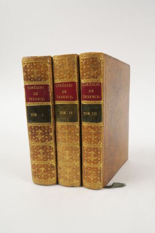 TÉRENCE. Les Comédies. Avec la traduction et les remarques de Madame Dacier. Rotterdam, Gaspar Fritsch 1717. 3 vol. in-16. Veau marbré, dos lisse orné, pce de titre rouge et verte (Rel. d'époque). Frontispice allégorique et figures hors-texte. Bel exemplaire, frais.