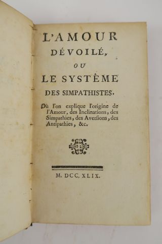 [THIPHAINE DE LA ROCHE]. L'Amour dévoilé, ou le Système des simpathistes, où l'on explique l'origine de l'Amour, des Inclinations, des Simpathies [sic], des Aversions, des Antipathies, etc. S. l., s. n. 1749. in-12, VIII-170 pp. Veau marbré, dos lisse orné, pce de titre (Rel. d'époque). Edition originale. Vision "mécaniste" de l'amour, qui serait du à l'émanation d'un « fluide sympathique », anticipant la théorie des phéronomes. L'auteur est parfois classé comme auteur de science-fiction. Lég. us. aux coiffes.
