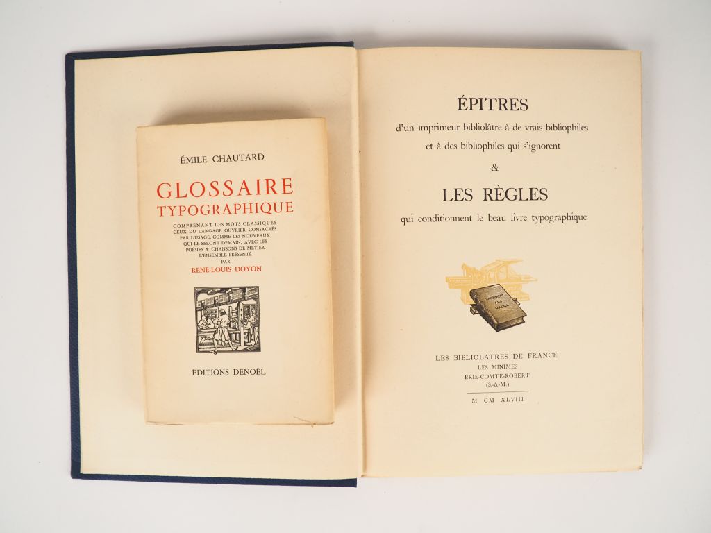 [Typographie] CHAUTARD (Emile). Glossaire typographique, comprenant les mots classiques, ceux du langage ouvrier consacré par l'usage comme les nouveaux qui le seront demain… Paris, Denoël s.d. (ca 1930). In-12, br. - BAUDELOT (E). Epitres d'un imprimeur bibliolâtre à de vrais bibliophiles et à des bibliophiles qui s'ignorent et les règles qui conditionnent le beau livre typographique. Brie-Comte-Robert, Les Bibliolâtres de France 1943. in-folio. Cartonnage éditeur