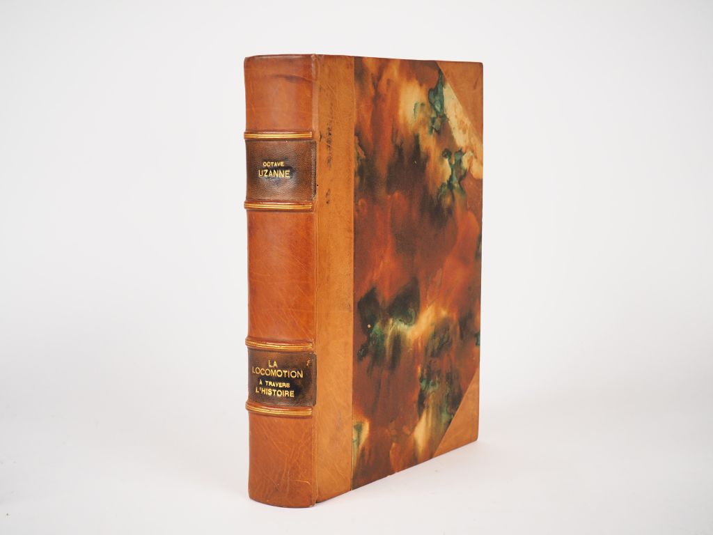 UZANNE (Octave). La locomotion à travers l'histoire et les mœurs. Illustrations dans le texte et hors-texte de Eugène Bourgoin. Nombreuses reproductions d'estampes anciennes. Paris, Ollendorff 1900. Fort volume gd in-8. Reliure demi veau blond, coins, pces de titre brune, couv. et dos 20 planches d'illustrations originales couleurs montées en tryptiques. Belle couverture illustrée imprimée sur papier rouge gaufré.