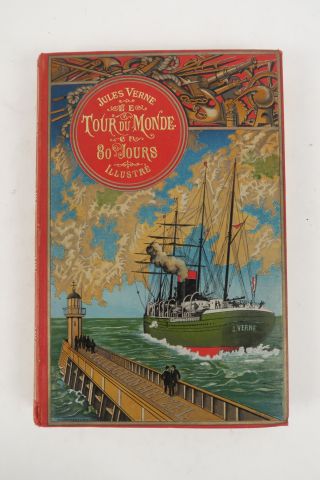 VERNE (Jules). Le Tour du Monde en quatre-vingt jours. Dessins par De Neuville et Benett. Paris, Hetzel s. d. gd in-8. Volume simple. Percaline large composition polychrome au Steamer, tr. dor. (Rel. éditeur). Cartonnage frais.
