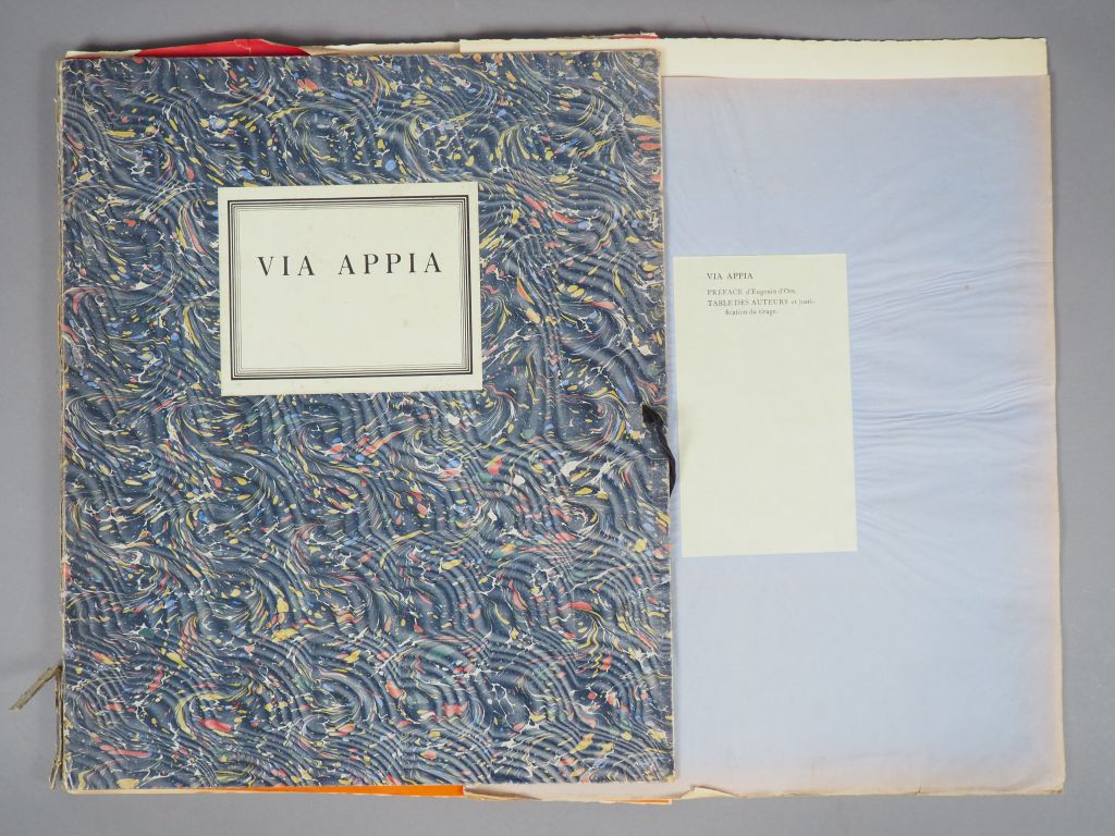 VIA APPIA. Quelques essais d'épigraphies lapidaires exposées au premier salon de l'Art mural (Paris 1935). Madrid Paris Buenos Aires. 1935. Port-folio en feuille sous chemise cartonnée. Receuil d'Inscrptions d'Eugène Marsan, Frédéric Mistral, Paul Jean Toulet, Paul Valéry. … Préface Eugenio d'Ors….. Présentée sous chemise de couleur. Tirage limité à 300 ex.