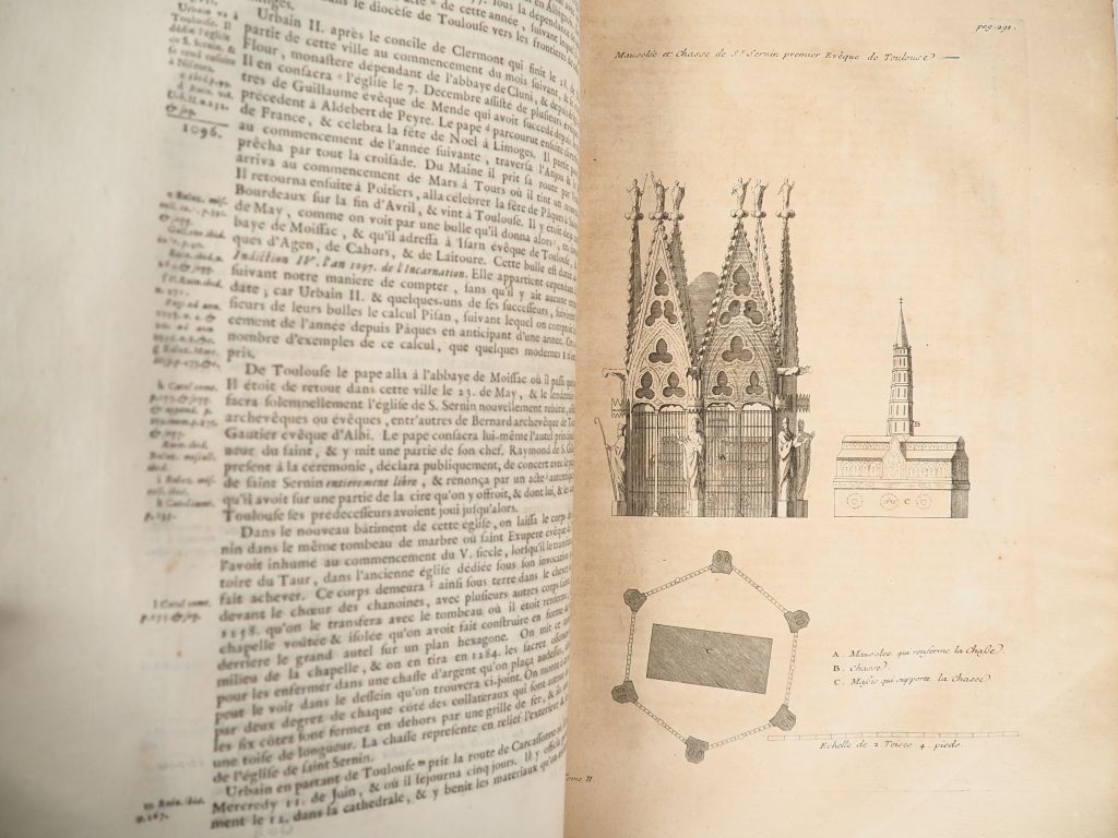 VIC (Dom Claude de) et VAISSÈTE (Dom Joseph). HISTOIRE GÉNÉRALE DE LANGUEDOC, avec des Notes et les Pièces justificatives. Paris, Jacques Vincent, 1730-1745. Cinq volumes in-folio veau fauve marbré, dos six nerfs, caissons dorés très ornés, pièces de titre et de tomaison maroquin rouge, encadrement de triple filet à froid sur les plats, tranches rouges (Reliure de l'époque). T. I : XX-758 pages, 214 pages (dont 4 ff. de planches gravées num. de 1 à 4 puis 210 pp. à 2 colonnes ), (1) f. d’approbation et privilège 1 carte à double page et dépliante aquarellée, 4 planches à double page montées sur onglets – T. II : (3) ff., 648 pages, 703 pages paginées à 2 colonnes, (1) page d'errata et avis aux relieurs, 2 cartes aquarellées (dont 1 dépliante), 2 planches (dont 1 dépliante) – T. III : X-606 pages, 706 pages paginées à 2 colonnes, 2 planches dépliantes – T. IV : XXII pages, (1) f. de sommaire, 1 carte dépliante, 520 pages, 570 pages paginées à 2 colonnes, (1) page d'errata et approbation, 1 carte à double page dépliante aquarellée, 9 planches (dont 7 dépliantes) – T. V : VII pages, (3) pages, 688 pages, 494 pages paginées à 2 colonnes, (1) page d’errata, 14 planches (dont 3 dépliantes et 8 de sceaux). Manques à 3 coiffes, mors en partie fendus mais coutures solides, coins émoussés. Ex-libris daté « 1930 ». ÉDITION ORIGINALE de L'UNE DES MEILLEURES HISTOIRES RÉGIONALES JAMAIS PUBLIÉES. Elle est illustrée de 4 CARTES rehaussées à l'aquarelle (dont 3 dépliantes) et de 35 PLANCHES hors-texte (dont 17 dépliantes) en comptabilisant comme « planches hors-texte » les 4 planches gravées qui sont comprises dans la pagination de la partie Preuves de l’histoire de Languedoc au t. 1. Également vignettes de titre, 54 bandeaux, 56 lettrines et 36 culs-de-lampe gravés par Cochin, Rigaud et Tardieu. L'OUVRAGE REMARQUABLE PAR SON AMPLEUR, SON ÉRUDITION ET SON STYLE, commence à l'an de Rome 163 et s'arrête à la mort de Louis XIII, en 1643. A la fin de chaque volume sont rassemblés les inscriptions antiques, les diplômes, les chartes et autres documents servant de preuves au texte du traité. SÉDUISANT EXEMPLAIRE en reliure strictement uniforme, condition peu commune puisque le 5ème tome est paru 15 ans après les quatre premiers et COMPLET de toutes les planches et cartes. ¶ Saffroy, II, 26377 : « Ouvrage célèbre et justement estimé » - Brunet, V, 1029 : « Une des meilleures histoires particulières de nos provinces » - Cohen, 1011 - Rothschild, 2347.