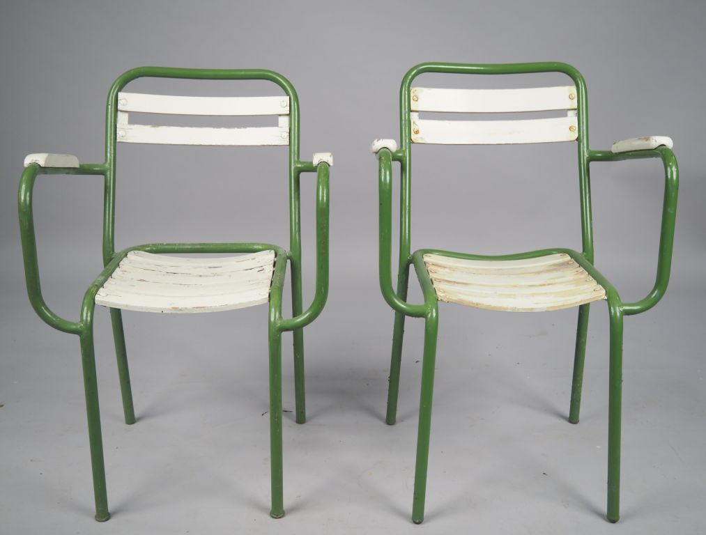 12 fauteuils de jardin en métal laqué vert et lattes de bois. (tous états)