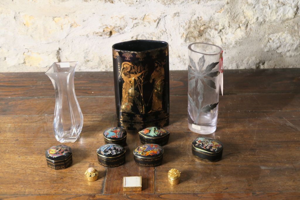 3 boites à pillules en métal doré. 6 boîtes à pilules musicales Vase en cristal de Sèvres. Signé. Vase en cristal à décor émaillé de fleurs polychromes. Vase en porcelaine à décor à l'antique.