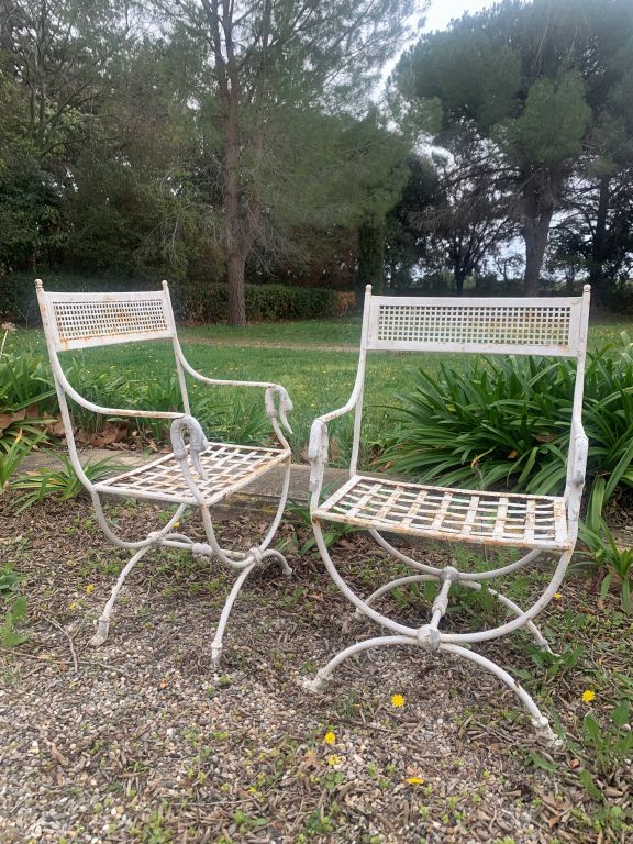 6 fauteuils de jardin en fer forgé relaqués blanc, accotoirs à col de cygne, piètement en X.