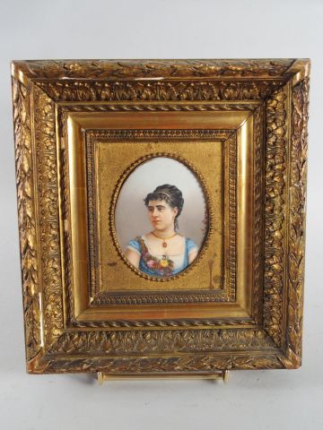 A. BARON 'Portrait d'élégante', en médaillon sur porcelaine, dans son cadre en bois et stuc doré de style Louis XVI. Dim. : 13 x 10 cm