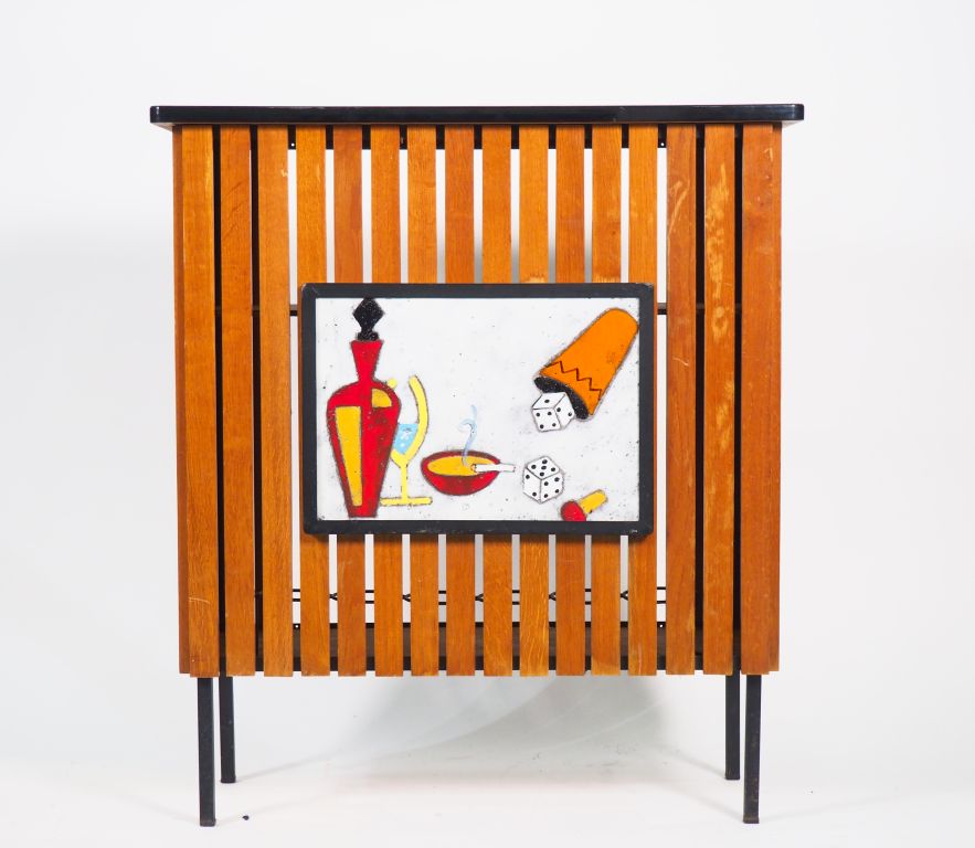 ADNET. Bar 1970 en chêne et laque noire, orné en façade d'une plaque en céramique à décor de nature morte. Dim. 99 x 88 x 34 cm
