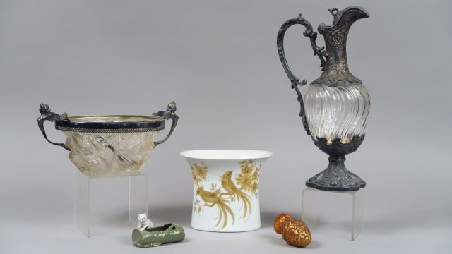 Aiguière de style Rocaille en verre et métal jardinière en verre et métal à décor de femmes aîlées tabatière en porcelaine petit vase en porcelaine blanche à décor d'oiseaux petit flacon en verre de Venise
