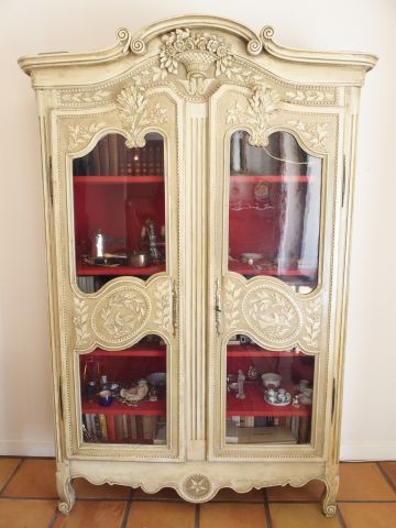 Armoire normande transformée en vitrine de style Louis XVI, en bois laqué blanc, mouluré et sculpté, à décor d'oiseaux, de paniers de fleurs et de feuillage