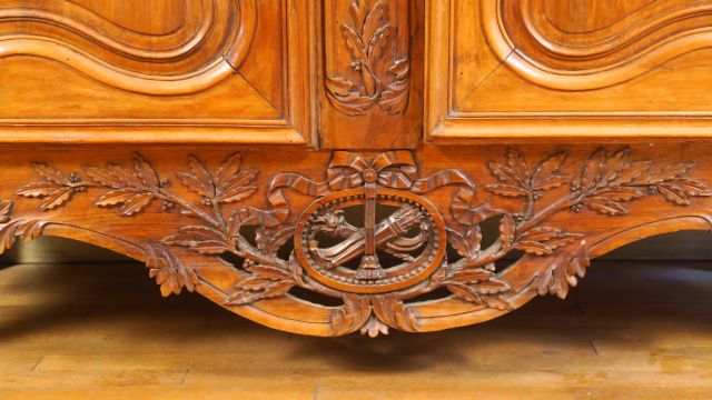 Armoire provençale Louis XV – Louis XVI en noyer et fortement sculpté, à décor de pampres, de fleurs, de branches d’olivier, de trophées d’instruments de musique et de nœuds de ruban, ouvrant à deux portes à trois panneaux, ceinture ajourée, pieds coquille, entrée de serrure trèfle