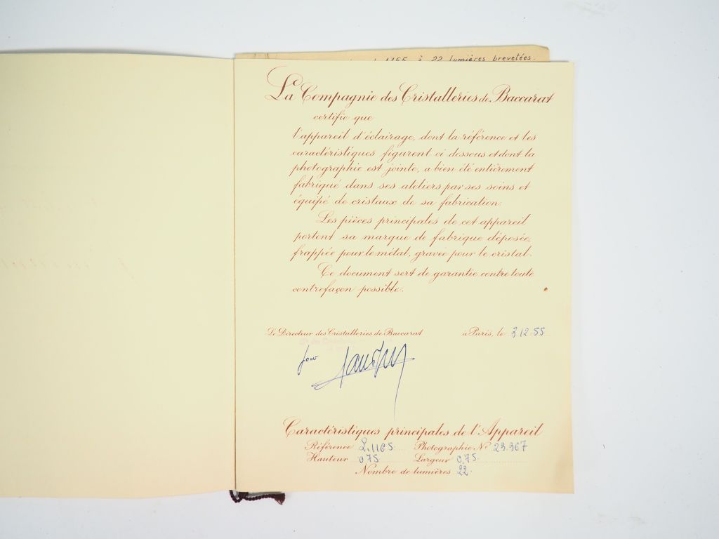 BACCARAT. Lustre L. II65 en cristal et métal à pampilles, éclairant à 22 lumières. Signé (frappé sur le métal). Avec son certificat d'authenticité daté du 3/12/1955. Dim. 75 x 75 cm. (Dispose de pièces de rechanges).
