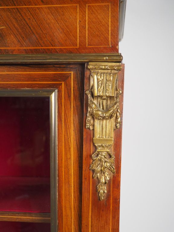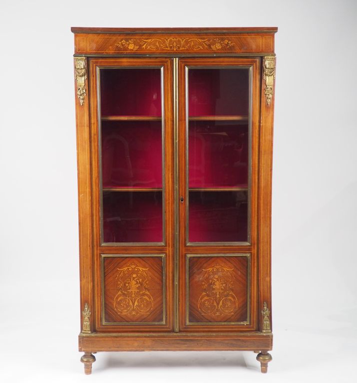 Bibliothèque Napoléon III de style Louis XVI en marqueterie, à décor de fleurs et de rinceaux feuillagés, ornementation de bronze Dim. 159 x 90,5 x 31 cm