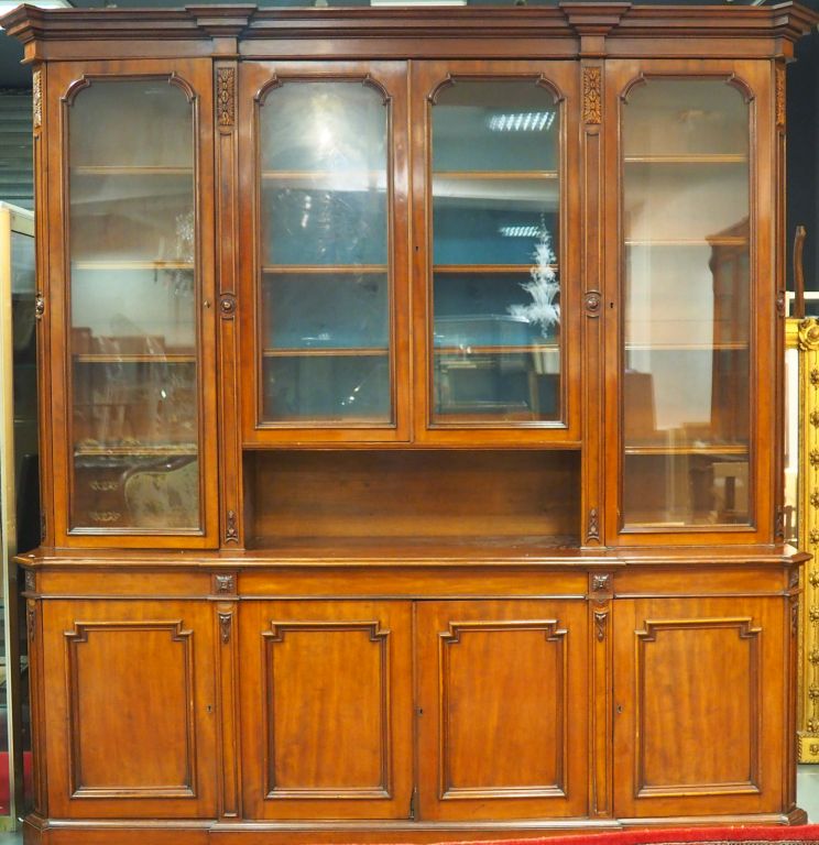 Bibliothèque XIXème en acajou et placage d'acajou, ouvrant à quatre portes vitrées et quatre vantaux. Dim. 253 x 237 x 45 cm