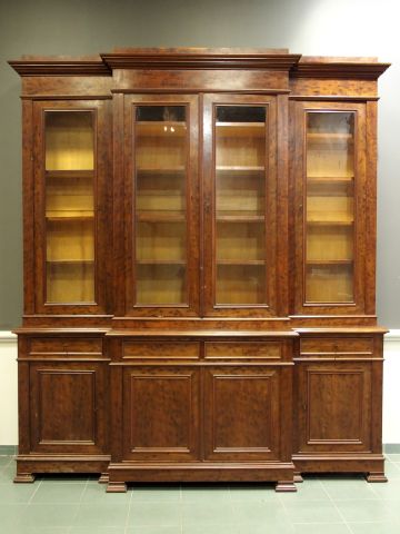 Bibliothèque XIXème en acajou moucheté, quatre portes, 4 tiroirs, quatre portes vitrées en partie supérieure