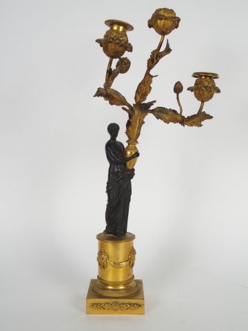 Bougeoir Restauration en bronze à double patine, à décor d'un personnage à l'antique tenant un branchage fleuri, éclairant à trois lumières. H. : 46 cm (anciennement monté en lampe, percé, manque une bobèche).