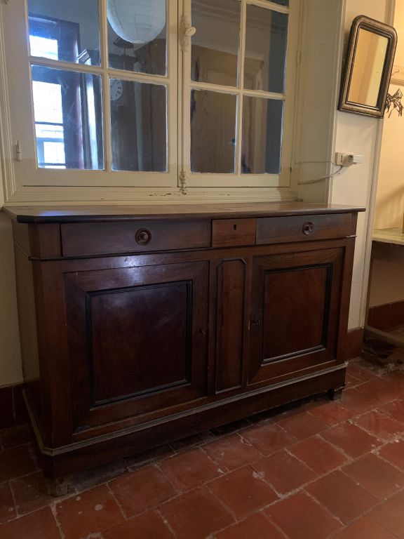 Buffet rustique XIXème en noyer, ouvrant à deux portes et deux tiroirs. (plateau bois fendu).