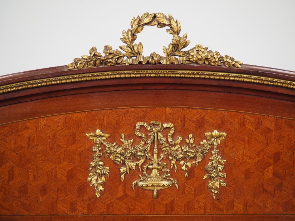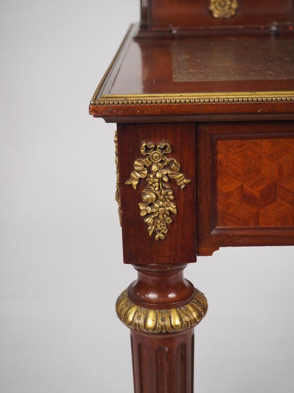 Bureau de dame et sa chaise cannée de style Louis XVI en placage d'acajou et marqueterie d'acajou à décor de cubes, belle ornementation de bronze doré. Dim. 104 x 82 x 53 cm
